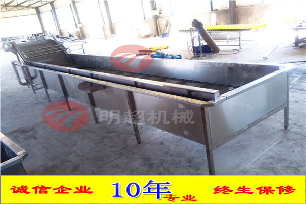 3. 清洗:根據(jù)所需清洗的蔬菜如果是葉類的可直接用翻浪式高壓氣泡清洗機(jī)清洗,如果是根莖類的蔬菜要先毛輥清洗機(jī)清洗去皮,然后進(jìn)氣泡清洗機(jī)洗完后直接提升到下一步工序。